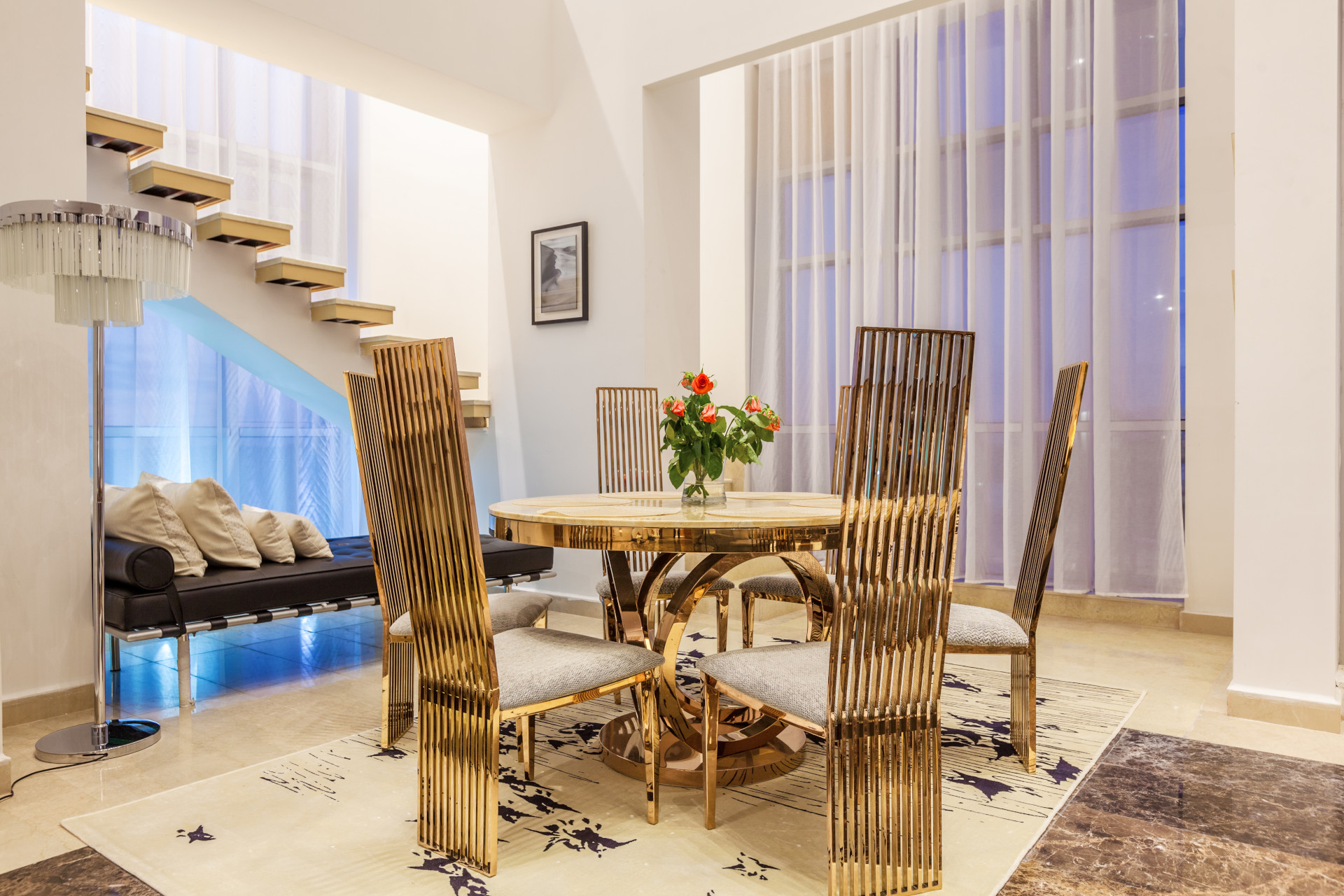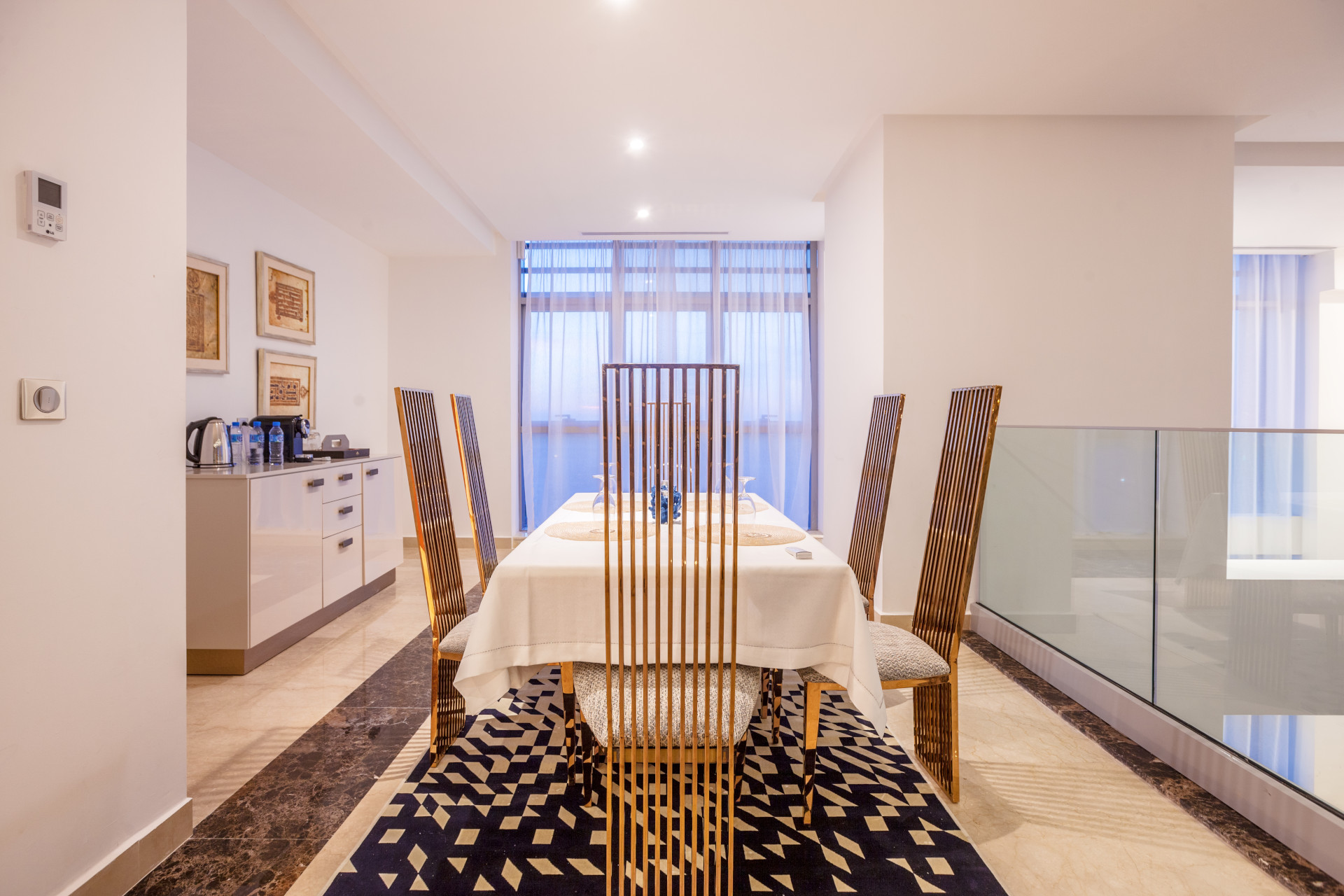 Découvrez le sommet du luxe dans notre Suite Présidentielle Duplex, perché au 13e et 14 étage de notre hôtel, offrant une expérience résidentielle unique.au premier niveau dispose de deux chambres spacieuses, toutes deux équipées de toilettes et de douches, vous accueillent dans un cocon de confort et d’élégance. À votre arrivée au salon et à la salle à manger, l’ampleur de l’espace vous captivera. Les grandes baies vitrées offrent une vue à couper le souffle sur la capitale, créant une toile de fond spectaculaire pour un séjour spéciale. Empruntez l’escalier intérieur pour accéder au deuxième étage du duplex, où une table à manger et un petit salon vous attendent. L’immense chambre principale, ornée d’un lit king size et d’un dressing somptueux, est une oasis de tranquillité. Les toilettes avec jacuzzi de luxe ajoutent une note de splandeure , transformant votre séjour en une expérience spa privée. La Suite Présidentielle Duplex est une fusion parfaite de raffinement et de confort, créant un espace où chaque détail est pensé pour dépasser vos attentes. Bienvenue dans une expérience de séjour sans pareil au cœur de l’hotel Ferdi Lilly.